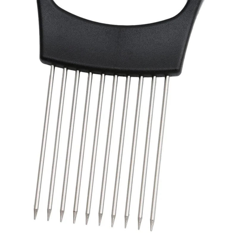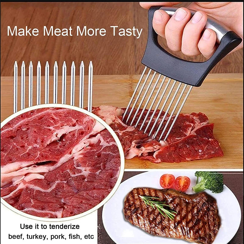 【Premium Materials】 Onion holder pushes easily into onions for appealing uniform slices. With sharp stainless steel fork tines and an extra wide handle. Makes comfortable full grip, sturdy use and lasts much longer than other brands in the market. Which means cooking faster, easier and without fear of loosing a digit.